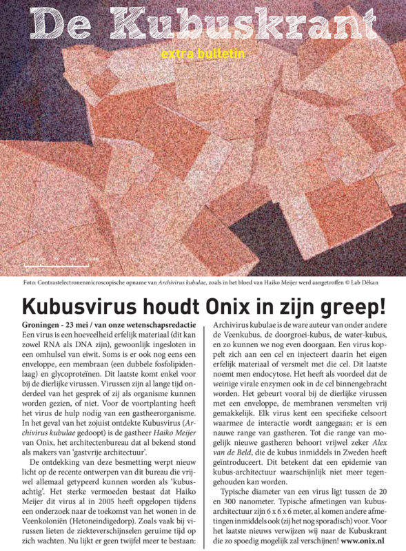 Vanwege de doorlopende verspreiding van het Kubusvirus is de Kubuskrant nu ook digitaal beschikbaar. In deze uitgave leest u alles over de kubus: een zeer betaalbaar, multifunctioneel, houten bouwwerk van 6 x 6 x 6 meter, dat bijvoorbeeld dienst kan doen als woning of atelier. In de krant gaan we in op het ontstaan van de kubus en schetsen we de vele gebruiksmogelijkheden. Ook presenteren we in de krant het Onix-project ‘High Five’, dat is gericht op zelfbouw van een kubus onder professionele begeleiding. Natuurlijk blijft het ook mogelijk om de Kubuskrant via de post te ontvangen, u kunt hiervoor een e-mail sturen naar kubus@onix.nl. Download hier de Kubuskrant.