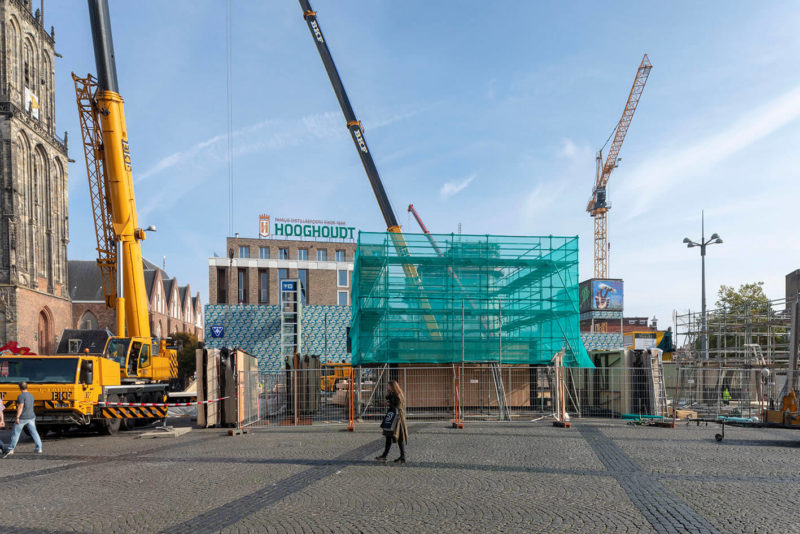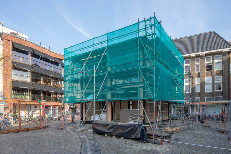 ‘Er ontstond al snel een link naar hergebruik – we moesten gebruik maken van bestaande plastic afvalstromen. We kwamen, niet geheel toevallig, uit bij reclameborden die gebruikt worden in de makelaardij. Deze (gevel)borden zijn gemaakt van polystyreen kanaalplaten, een heel licht materiaal waar we onze bouwstenen uit konden lasersnijden. Het onderzoek ging met name over hoe kunnen we de meeste impact bereiken met zo min mogelijk materiaal, met welke groottes moeten we dan werken, moet het één bouwsteen zijn of verschillende? Hoe verbinden we en hoe zorgen we ervoor dat we ter plekke kunnen improviseren? Uiteindelijk zijn we inderdaad gaan bouwen zonder te weten wat het eindbeeld zou zijn. Ons referentieobject is een propje papier: dat kun je steeds opnieuw gladstrijken en weer verfrommelen en zal er toch steeds anders uitzien. Dat is met onze oplossing ook het geval.’